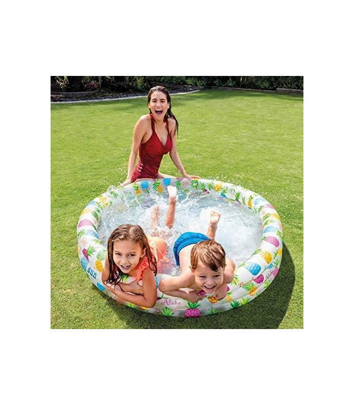 Piscina hinchable Intex de la línea Fishbowl, las medidas de la piscina son 132 cm de diámetro x 28 cm de alto y tiene capacidad para 248 litros de agua