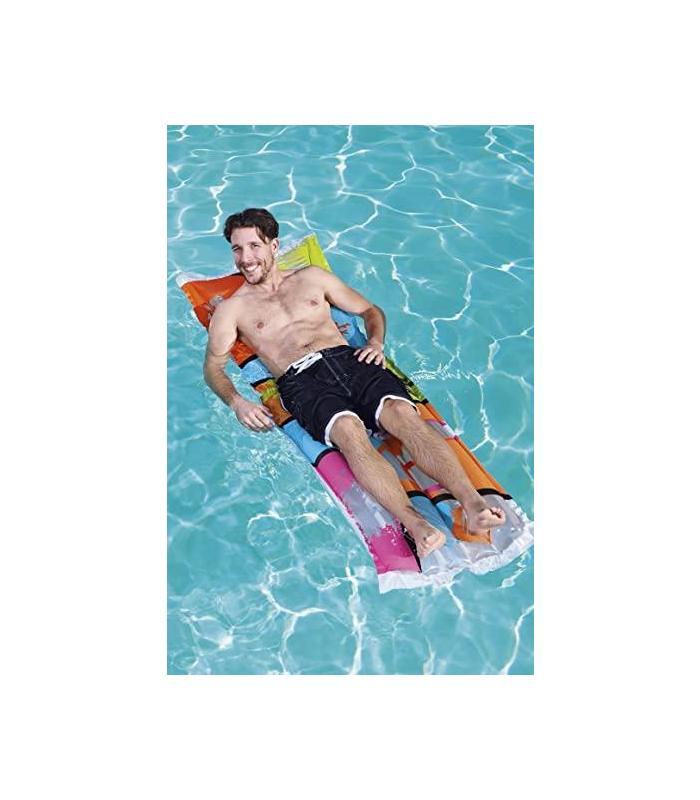 Divertida colchoneta con diseño colorido para que te relajes tumbado bajo el sol mientras flotas en la piscina o en la playa