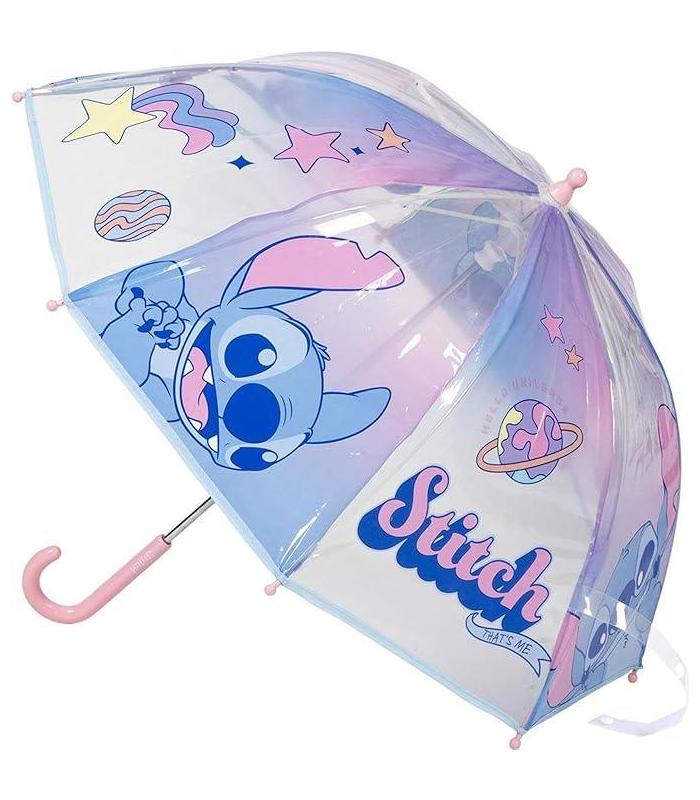 Paraguas tipo burbuja con diseño transparente decorado con ilustraciones coloridas de Stitch, ideal para niños y niñas fanáticos del personaje, ofreciendo una vista clara del exterior mientras se mantienen completamente protegidos de la lluvia.