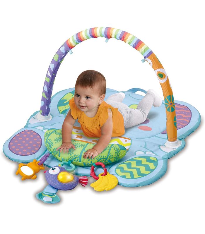 Manta para colocar en 3 posiciones y ocasiones diferentes según la evolución de los peques. Juego boca arriba, con un arco para colgar los muñecos y despertar sus sentidos. Juego boca abajo, para fortalecer la psicomotricidad gruesa. Almohada con 3 muñecos para colocar en la sillita de paseo.
