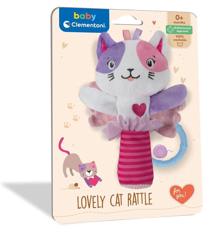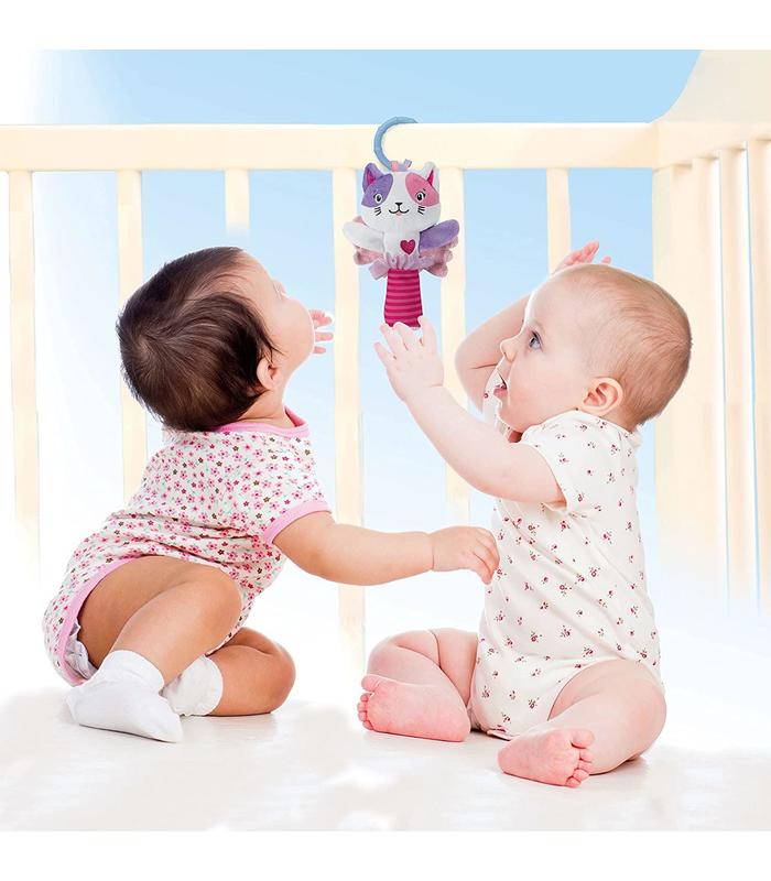 Un sonajero blandito de una gatita; con elementos que estimulan los sentidos, para así involucrar a los bebés en todos los niveles