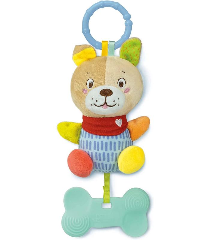 El peluche cuenta con un colgante de goma para mordisquear y aliviar las encías durante la fase de dentición