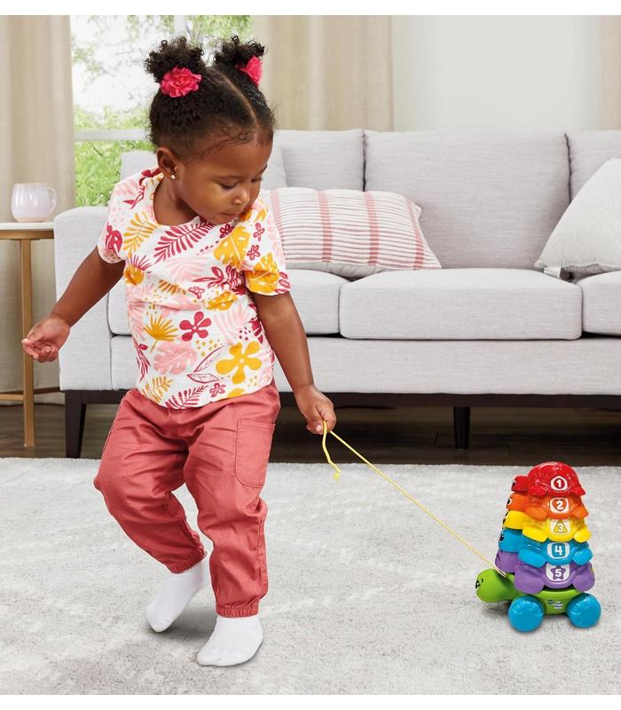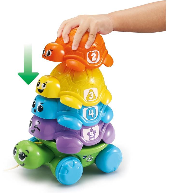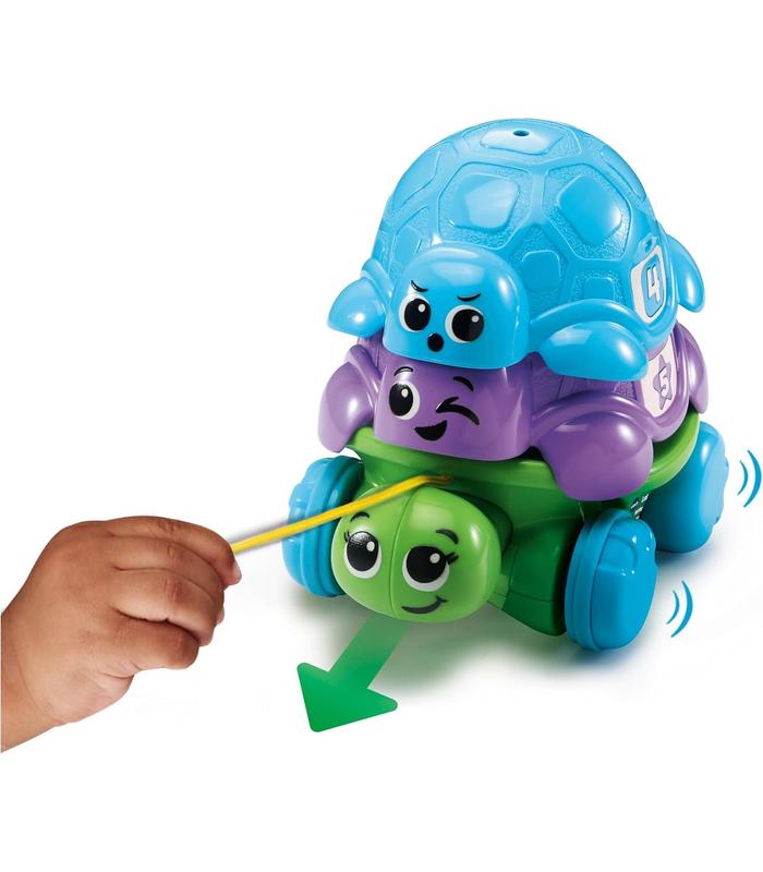 ENCAJA: Mete las tortugas pequeñas dentro de las grandes. APILA: De la más grande a la más pequeña. TIRA: Usa el cordón para ir de paseo. CUENTA: 5 caparazones con números y colores. ¡CUCÚ!: Mira cómo asoma la cabeza la mamá tortuga.