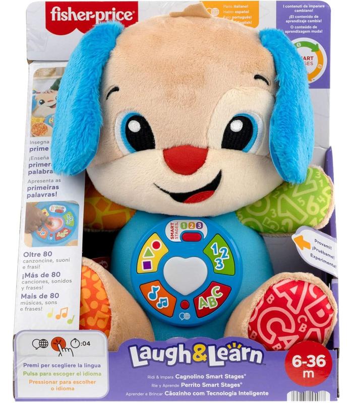 Fisher-Price Laugh & Learn Perrito con Smart Stages Peluche musical de aprendizaje con Smart Stages para bebés a partir de 6 meses, versión multilingüe: Italiano, Español, Portugués, Inglés, JFD26