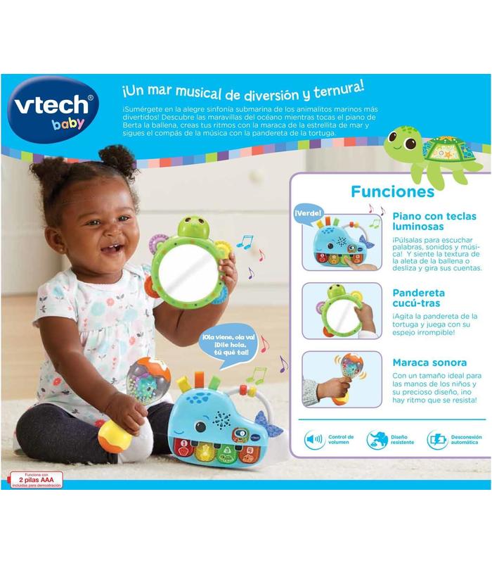 TRES JUGUETES EN UNO – Berta la ballena musical (piano luminoso), pandereta con espejo irrompible y maraca interactiva, ofreciendo experiencias únicas de juego y exploración.