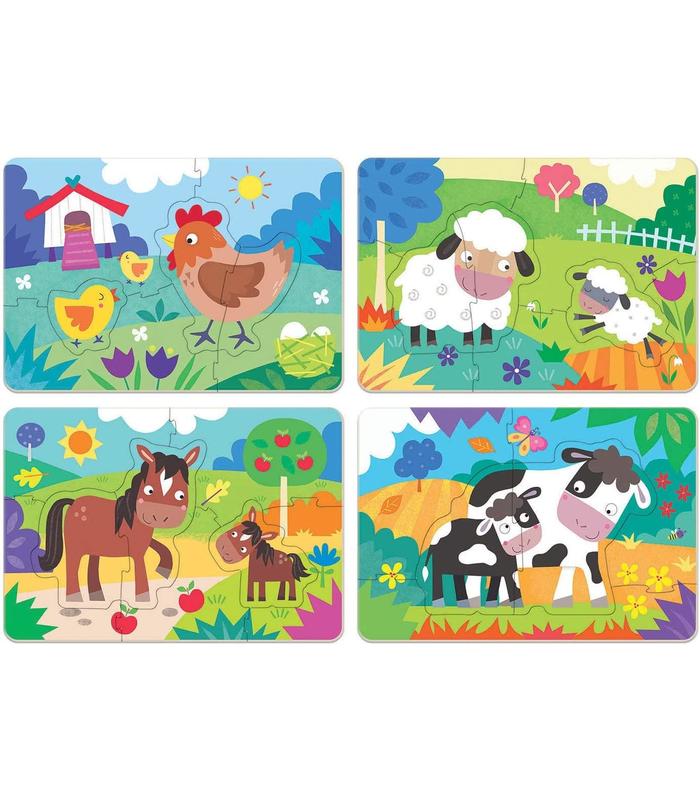Contiene 4 puzzles progresivos de 5 a 8 piezas. Cada puzzle, tiene además un elemento o personaje extraible de 1, 2 o 3 piezas: mama gallina con bebé pollito, mama oveja con bebé borrego, mama yegua con bebé potro y mama vaca con bebé ternero
