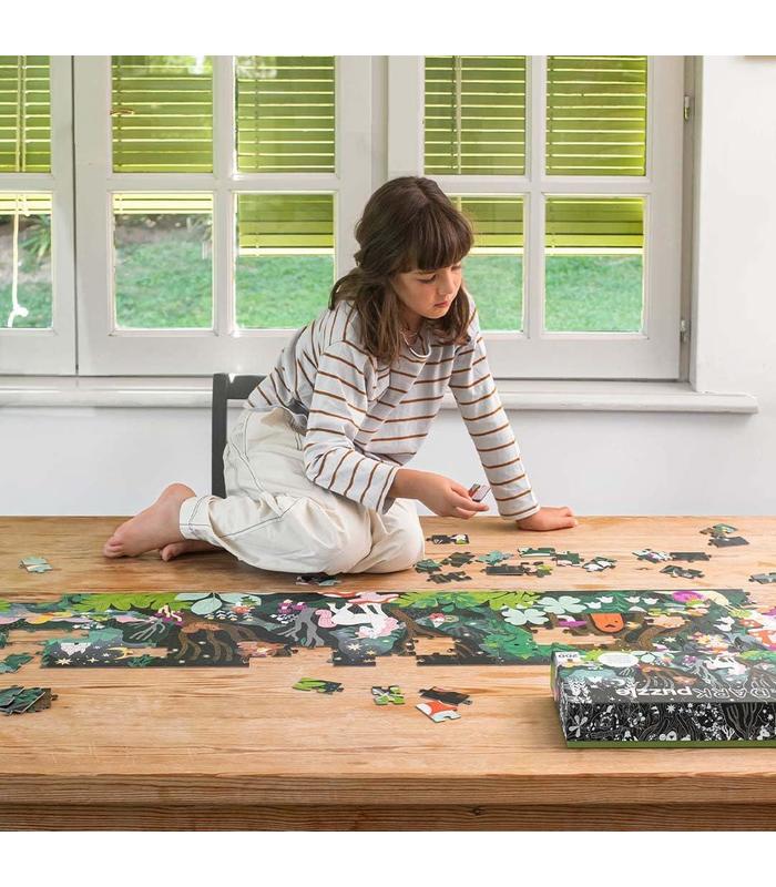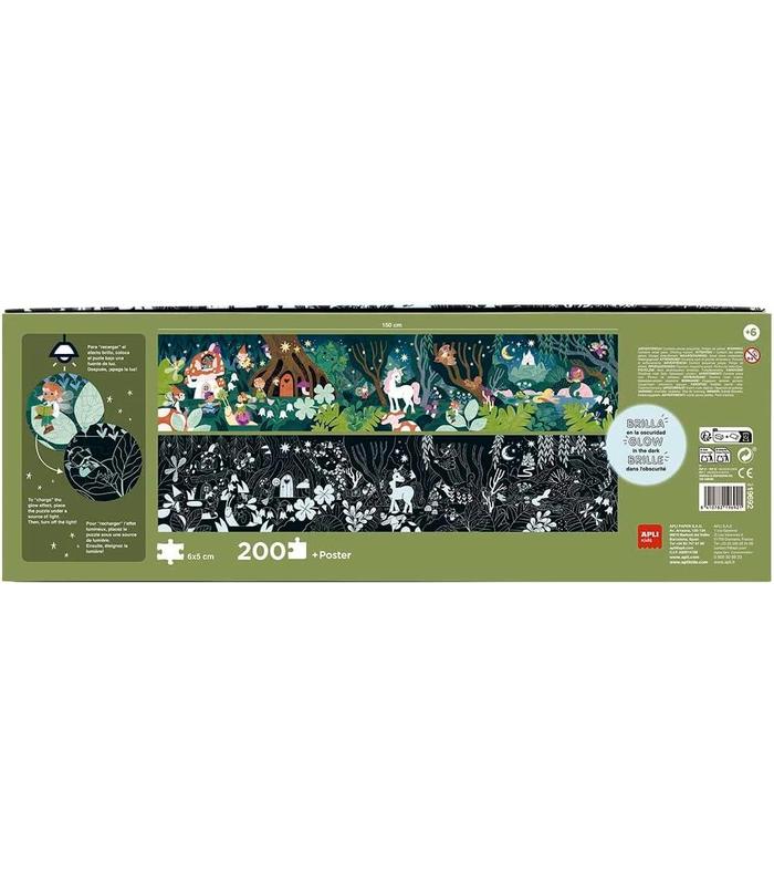 PUZLE infantil FLUORESCENTE Glow in the Dark con temática Bosque mágico. Incluye 200 PIEZAS tamaño 6 x 5 cm. Medida del puzle montado: 150 x 30 cm. Contiene un póster de tamaño real para facilitar el montaje