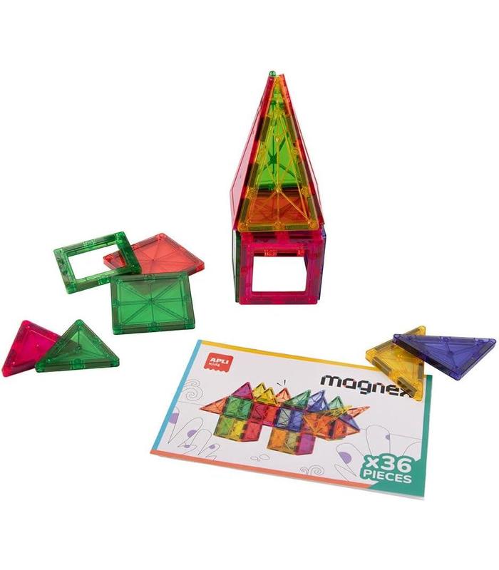 Set de piezas magnéticas 3D: Contiene 36 formas geométricas imantadas de diferentes tamaños y colores, ideales para crear construcciones creativas y estructuradas. Incluye guía ilustrada con modelos de ejemplo. Las instrucciones ayudan a inspirar nuevas construcciones y fomentan el juego autónomo y exploratorio.