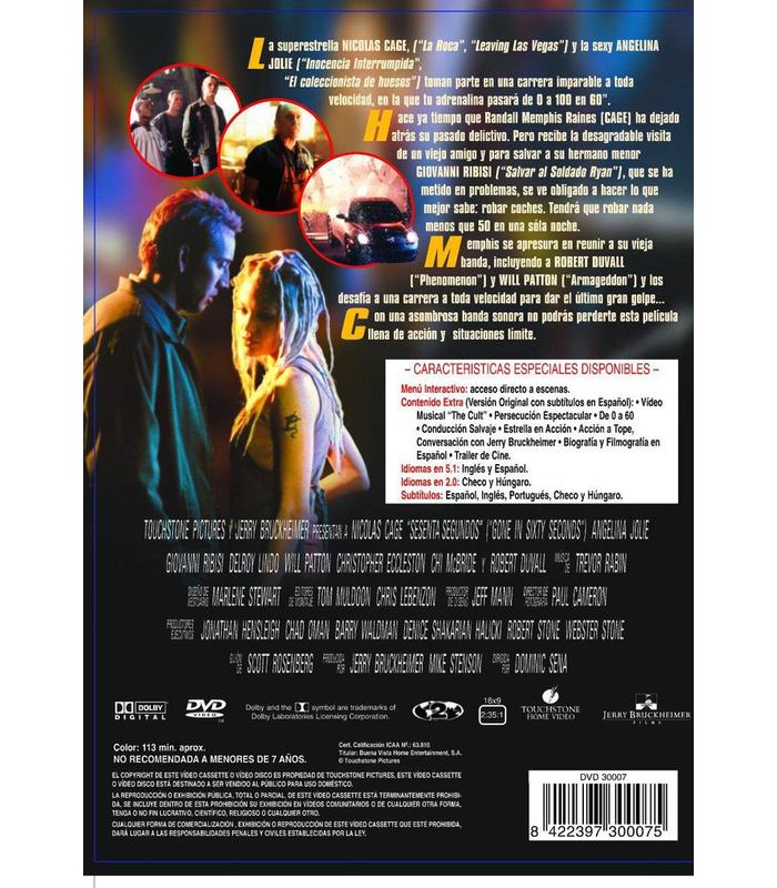 La superestrella Nicolas Cage y la sexy Angelina Jolie toman parte en una carrera imparable a toda velocidad, en la que tu adrenalina pasara de 0 a 100 en 60??. Hace ya tiempo que Randall Memphis Raines ha dejado atrás su pasado delictivo. Pero recibe la desagradable visita de un viejo amigo y para salvar a su hermano menor, que se ha metido en problemas, se ve obligado a hacer lo que mejor sabe: robar coches. Tendrá que robar nada menos que 50 en una sola noche. Memphis se apresura a reunir a su vieja banda, y los desafía a una carrera a toda velocidad para dar el último gran golpe... Con una asombrosa banda sonora no podrás perderte esta película llena de acción y situaciones límite.