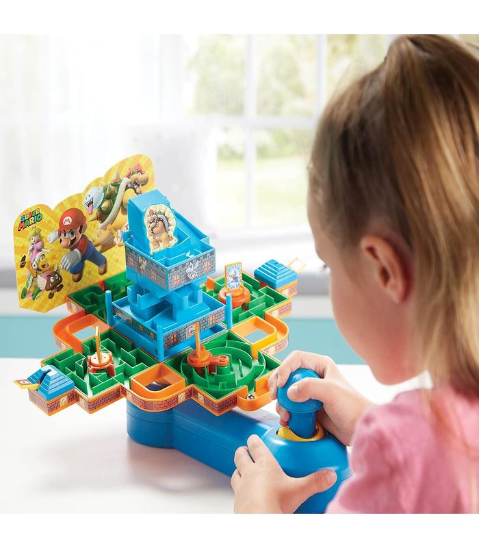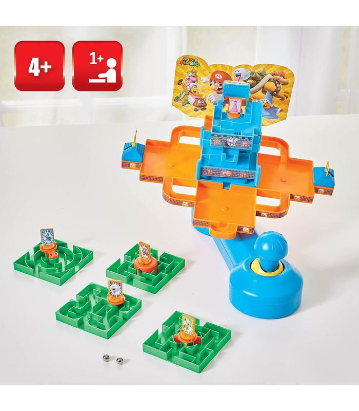 Juego de mesa de un solo jugador para edades de 4 años en adelante de Super Mario. Incluye joystick y base de juego, 4 laberintos únicos e intercambiables, placas de 5 caracteres y dos canicas. Utiliza el joystick manual para girar, girar y tejer a través de laberintos y hasta el castillo de Bowser para salvar a la princesa Peach. Ten cuidado con los trucos y trampas a lo largo del camino que te enviarán de vuelta a empezar. No recomendable para menores de 3 años, ya que contiene piezas pequeñas que podrían provocar asfixia en caso de ser ingeridas por el niño/a.