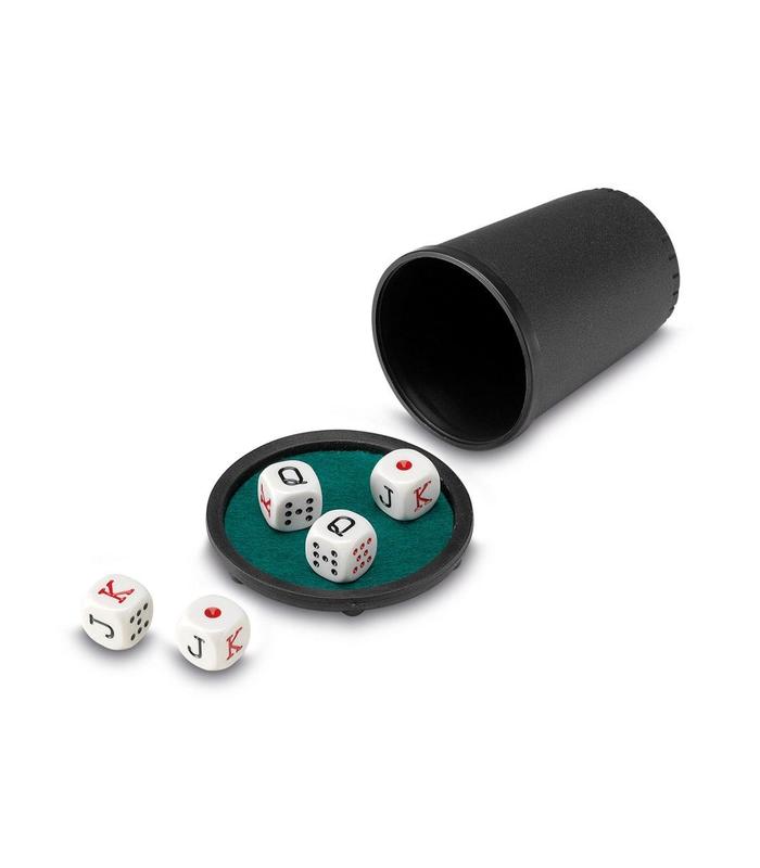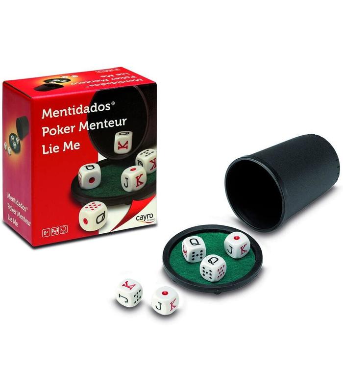 El juego lo componen, un cubilete, 5 dados de póker y una base para que al mover los dados tapados por el cubilete, estos no cambien de cara. Haz una combinación con los dados (trió, ful, etc) y pásalo al siguiente jugador, este podrá creérselo ó no.