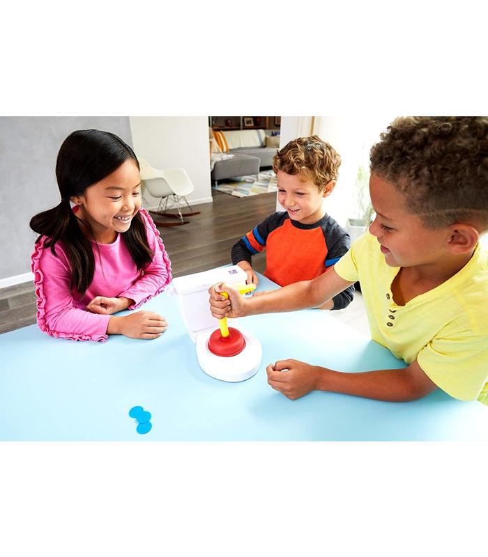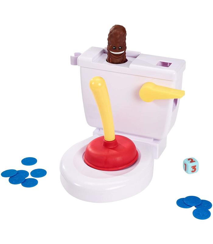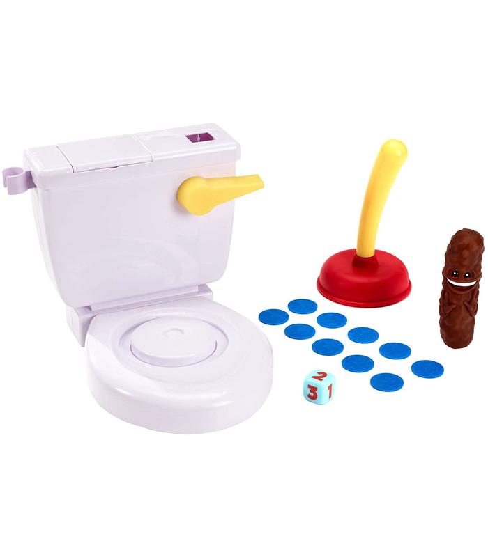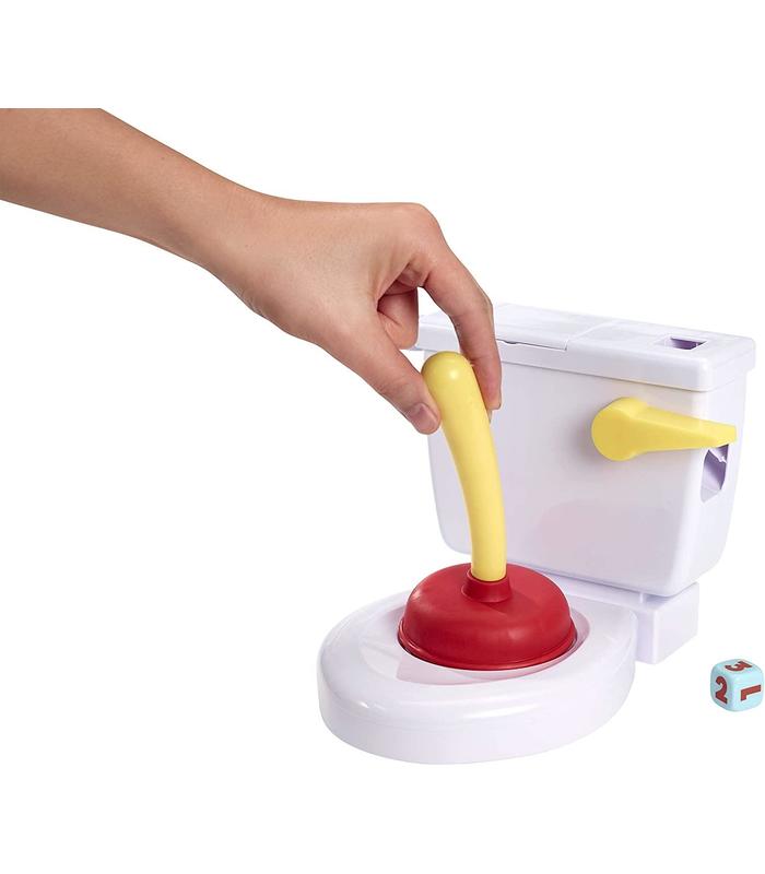 ¡Un juego con un desatascador, algo de caca y reacciones rápidas! Tira de la cadena para echar el dado, el número que salga será la cantidad de veces que tendrás que intentar desatascar el retrete. Pero, ve con cuidado, porque ¡la caca puede salir volando