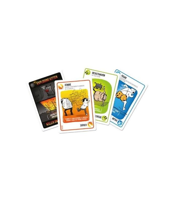 Se trata de una versión gatuna de la ruleta rusa con un gran componente estratégico. Los jugadores van robando cartas hasta que a alguien le sale un Exploding Kitten. Cuando esto sucede, esa persona muere y queda eliminada de la partida (a no ser que tenga una carta de Desactivación, que permite desactivar al Exploding Kitten con armas como punteros láser, friegas de barriga o bocatas de menta gatuna). El resto de las cartas de la baraja sirven para cambiar de lugar, mitigar o evitar a los Exploding Kittens.
