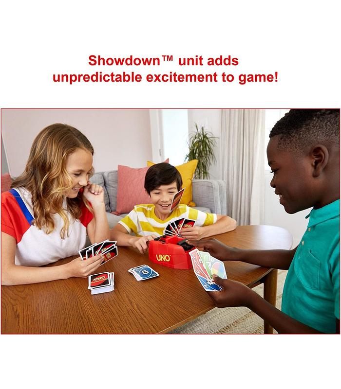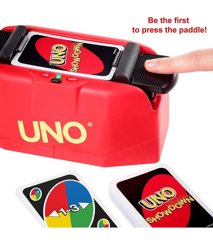 UNO Showdown es el juego de hacer coincidir cartas que todo el mundo adora, con la emoción inesperada de un enfrentamiento que implica el lanzamiento de cartas. Cuando escuches un sonido de relámpago y se apague la señal de la unidad UNO Showdown, intenta ser el primero en apretar la palanca. El jugador más rápido gana el enfrentamiento y envía cartas desde la unidad UNO Showdown a sus oponentes. Los jugadores deben intentar quedarse sin cartas en la mano jugando cartas que coincidan con la última carta de la pila de descarte. Cuando les quede una sola carta en la mano, ¡tienen que gritar "UNO"! Ideal para pasarlo en grande en una noche de juegos para niños, familias o adultos y es un regalo fantástico para jugadores mayores de 7 años. Contiene 112 cartas.