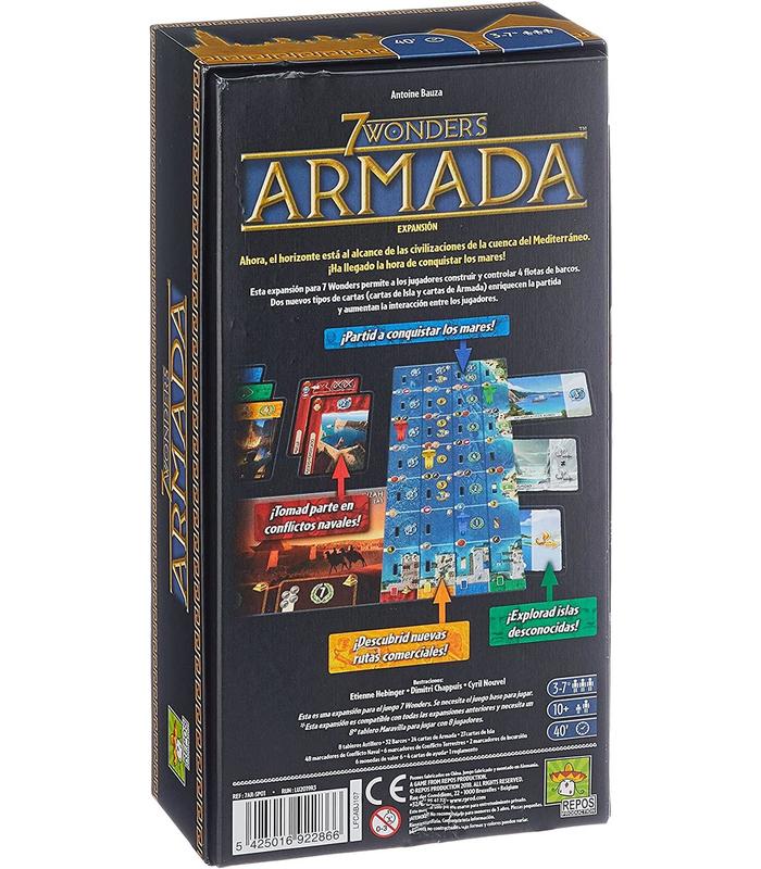Esta expansión de 7 Wonders te permite armar flotas de Barcos para conquistar los mares. Las nuevas cartas de Isla y cartas de Armada enriquecen la partida y aumentan la interacción entre los jugadores. La dinámica del juego cambia ligeramente, pero las condiciones de victoria son idénticas a las del juego base de 7 Wonders.