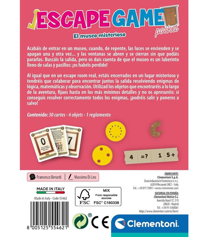 ¡Un museo que contiene siglos y siglos de historia, con muchos enigmas que resolver como un verdadero detective para poder salir y desbloquear la puerta de entrada! Un juego con cartas y muchos misterios que hay que resolver retrocediendo en la historia para salir del museo, ¡como en un escape room de verdad! Un entretenimiento único y una aventura para disfrutar enigma tras enigma, entrenando tu mente y desarrollando el pensamiento lateral y la lógica. Cada carta esconde una pista para continuar la aventura e intentar salir del museo. El juego incluye una baraja de cartas con enigmas y otros objetos útiles para encontrar las pistas. Un juego ideal para adultos y niños que sigue una tendencia muy actual, la del escape room, para jugar juntos y estimular el intelecto divirtiéndose. Jugadores: De 1 a 6 jugadores. Edad recomendadada: + 8 años. No recomendable para menores de 3 años, ya que contiene piezas pequeñas que podrían provocar asfixia en caso de ser ingeridas por el niño/a.