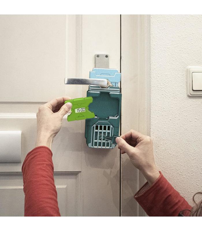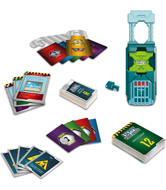 Contenido: 6 misiones, cerradura de la puerta, llave de la puerta, temporizador, 78 cartas de enigma, 55 cartas de respuesta, 6 colgantes para puerta, 3 tarjetas de misión, tarjeta de distribución de zonas y puntuación y reglas del juego