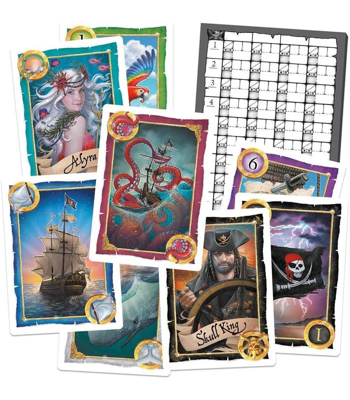Skull King es un divertido juego de cartas para toda la familia en el que te convertirás en un astuto pirata. Declara tu botín al empezar la ronda, muerde tu cuchillo y arrebata tesoros y bazas a los demás jugadores. Desagradables piratas, hermosas sirenas y el poderoso rey de los piratas Skull King frustrarán a menudo tus planes. Un divertido juego cargado de emocionante pirateo.