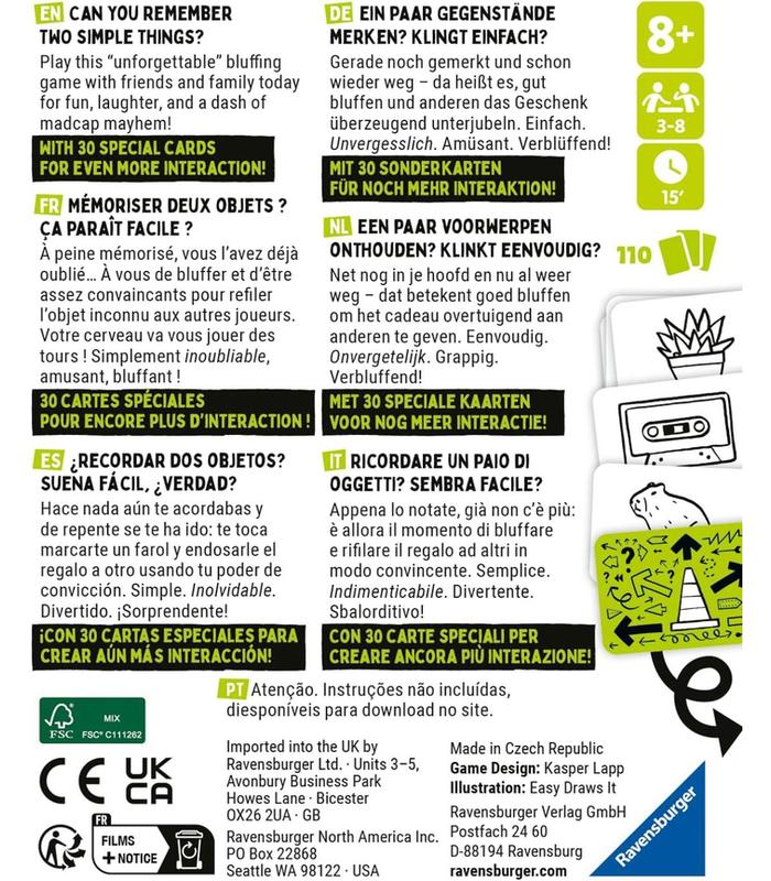 CARACTERÍSTICAS: número de jugadores 3-8, edad recomendada 8+, duración 15 minutos, edición en castellano