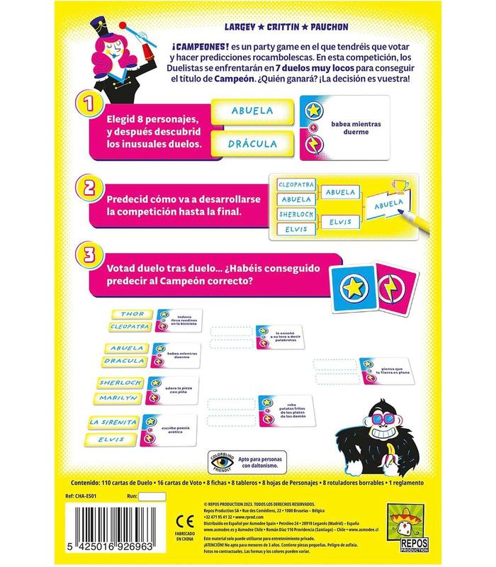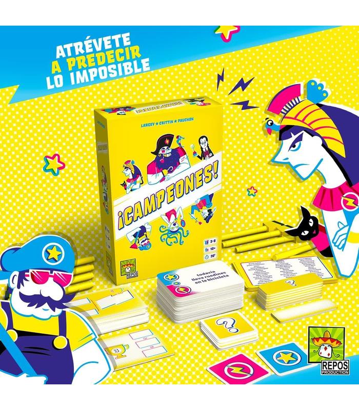 ¡Campeones! es un party game para jugar con familia y amigos en el que tendréis que votar y hacer predicciones rocambolescas.