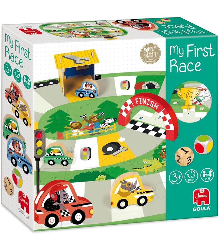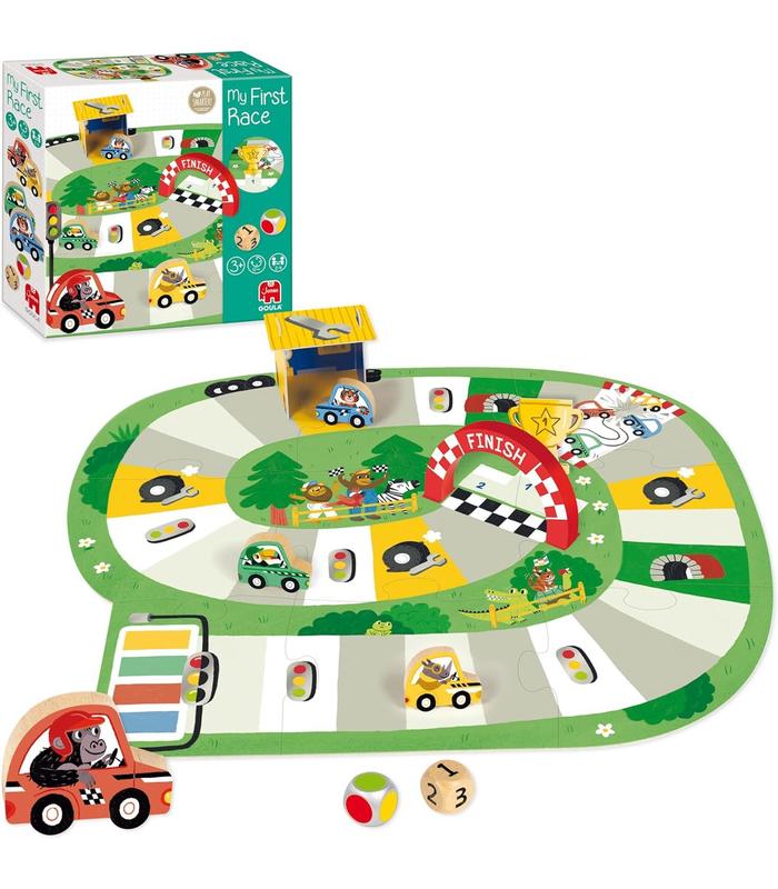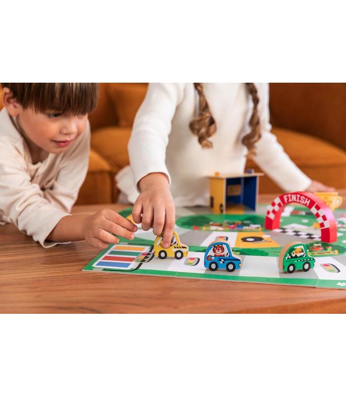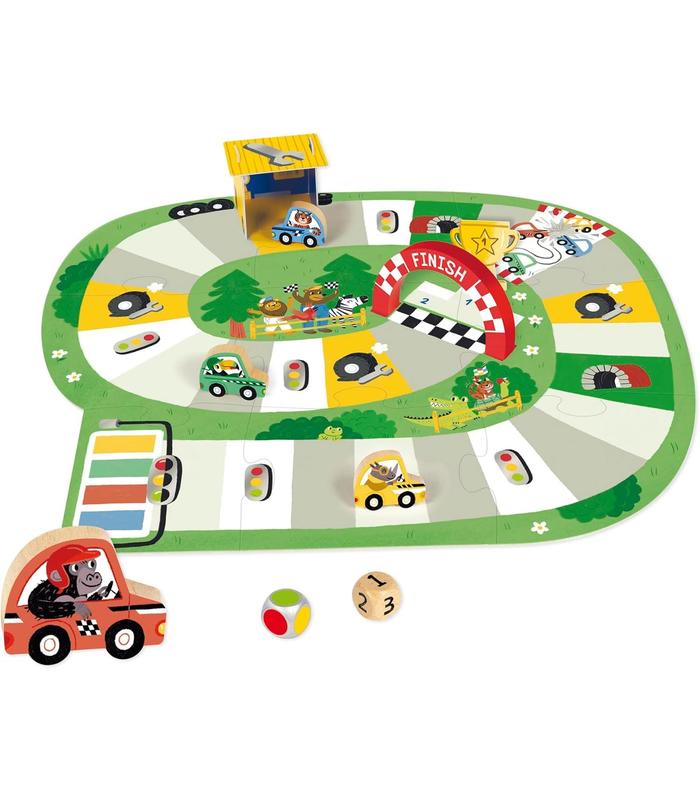 Contenido: 4 coches de madera de diferentes colores, 1 dado numérico y 1 dado de colores, Tablero-puzzle, Taller mecánico 3D