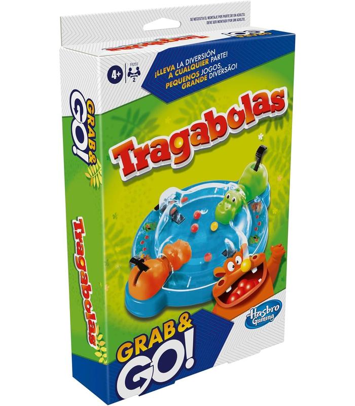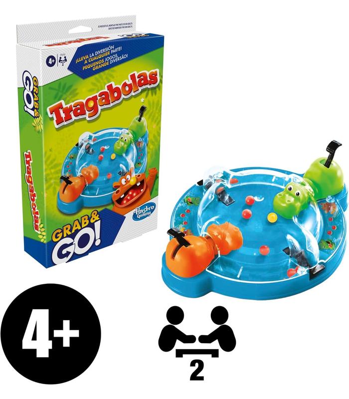 VERSIÓN PORTÁTIL DEL JUEGO TRAGABOLAS: El juego Tragabolas Grab and Go es una versión compacta del juego Tragabolas Comilón. (Incluye 2 hipopótamos en lugar de 4)