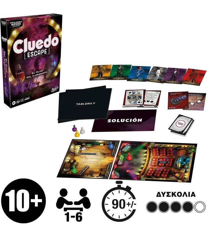ESCAPAD DE UN CLUB DE MAGIA, RESOLVED UN COMPLICADO MISTERIO: Regresa el infame elenco de Cluedo, esta vez con cartas bajo la manga: ¡Uno de ellos ha saboteado el truco de una famosa maga! El juego Cluedo Escape: El Club del Ilusionista ofrece la intriga del clásico juego Cluedo al estilo Escape de la Habitación.