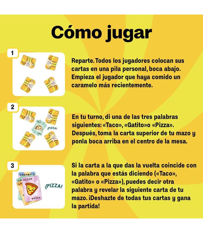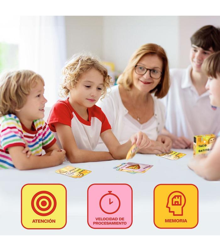 2 A 6 JUGADORES: Taco gatito es un juego de mesa familiar donde podrán jugar de 2 a 6 jugadores, es perfecto para jugar en familia o con amigos y pasa un buen rato. Con este juego cartas cuando la carta coincida con la palabra que dice, tienes que colocar la mano en el montón central y el último en poner la mano se lleva el montón.
