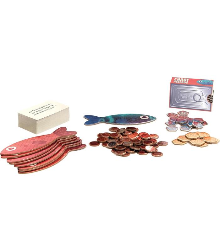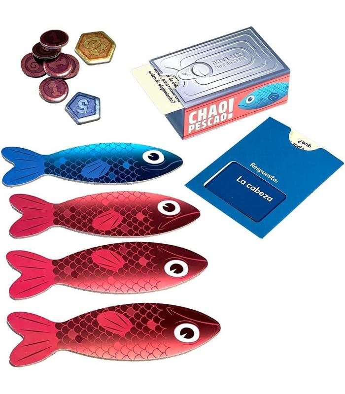 ¿QUÉ INCLUYE? - El juego contiene 9 figuras de peces, 8 fichas de puntos, 100 cartas de preguntas a doble cara, un dispensador de cartas, un sobre y un reglamento.