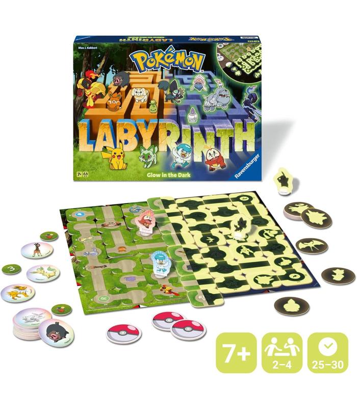 POKÉMON: En esta versión en la oscuridad, cada jugador tiene la tarea de capturar a todos los Pokémon escondidos en un increíble laberinto encantado, moviéndose a lo largo de los caminos mágicos del juego; duplica la diversión con los 2 modos de juego "Día" o "Noche"