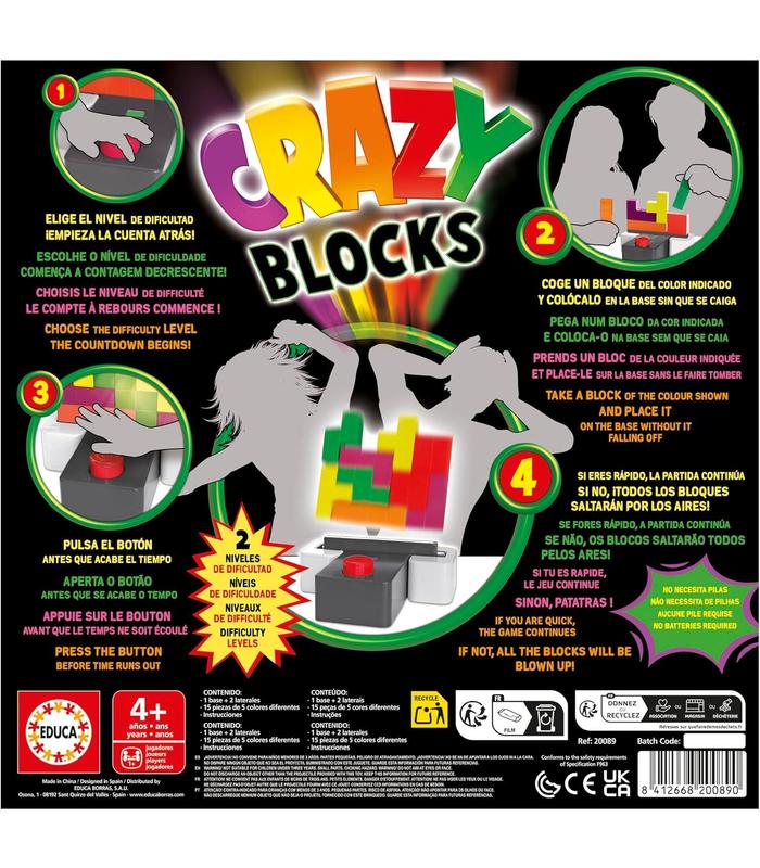 ¡O eres rápido colocando bloques o saltarán por los aires! Contenido: - 16 bloques de colores - Base de juego - Instrucciones