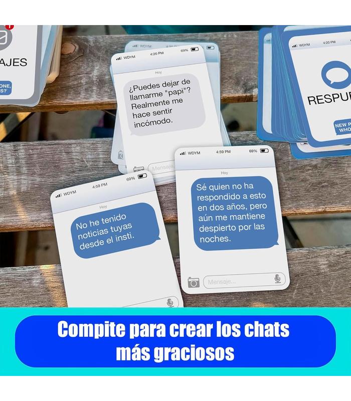 CÓMO JUGAR: En cada ronda, uno de los jugadores roba una carta de inicio de chat y los demás tienen que encontrar la carta de respuesta más divertida. Cuando todos hayan jugado su carta, el juez decidirá cuál es la más graciosa. El ganador se lleva un punto. Gana quien tenga más puntos