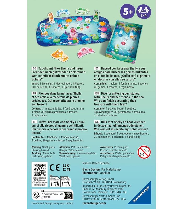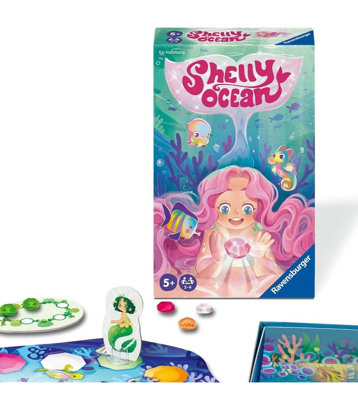 SHELLY OCEAN: Este juego de correr y coleccionar combina habilidad y hermosas piedras preciosas de colores. Golpea tus piedras hacia los agujeros y deja que el animal del arcoíris determine tu avance en el tablero. Si caes en un campo de tu color, añade una gema a tu tesoro. ¡El primero en recolectar cinco gemas gana! Con ilustraciones encantadoras y una temática de sirenas