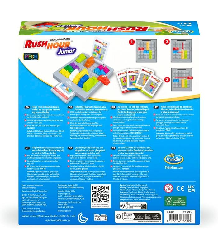 NUEVA EDICIÓN - RUSH HOUR JR: Rush Hour Junior, es uno de los juegos de mesa STEM y de lógica más conocidos de todos los tiempos: Usa la lógica para mover los coches y sacar al coche de bomberos del atasco