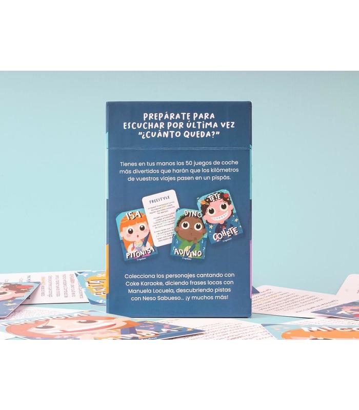 Tarjetas XL para poderlas leer cómodamente y formato estrecho para poder guardarlas en cualquier hueco del coche. Con ¿Cuánto queda? desaparece por fin el aburrimiento viajando gracias a 50 nuevos juegos que mantendrán entretenida a toda la familia. ¡No querréis que el viaje se acabe! Cambia las cosas de sitio con Neso Sabueso e intenta que los demás no se den cuenta, demuestra tus habilidades en freestyle con Gero el Rapero, invéntate las preguntas más disparatadas con Manuela Loculela… ¡y mucho más!. Vayas donde vayas, la diversión no termina mientras viajas. Prepárate para escuchar por última vez “¿Cuánto queda?”