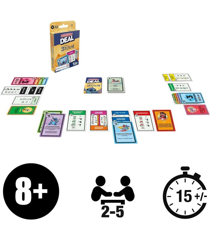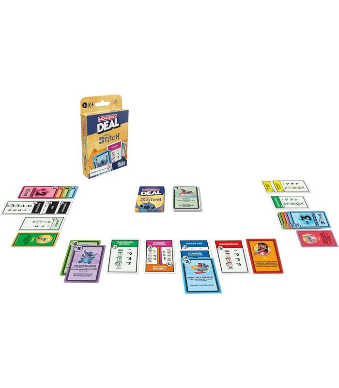 INSPIRADO EN STITCH DE DISNEY: El juego de cartas Monopoly Deal: Edición Disney Stitch combina la rápida diversión del juego Monopoly Deal con personajes y temas inspirados en el adorable alienígena de Lilo & Stitch