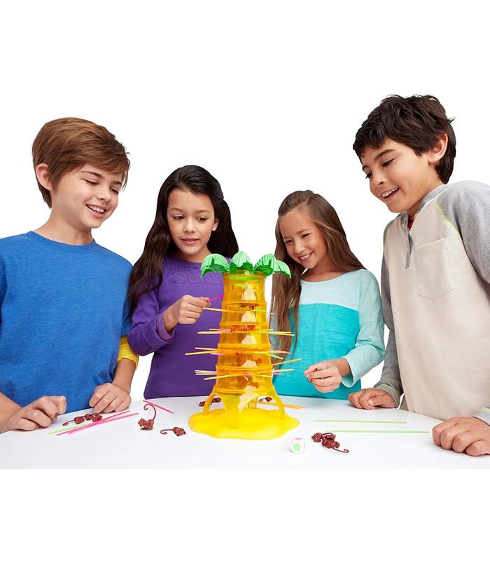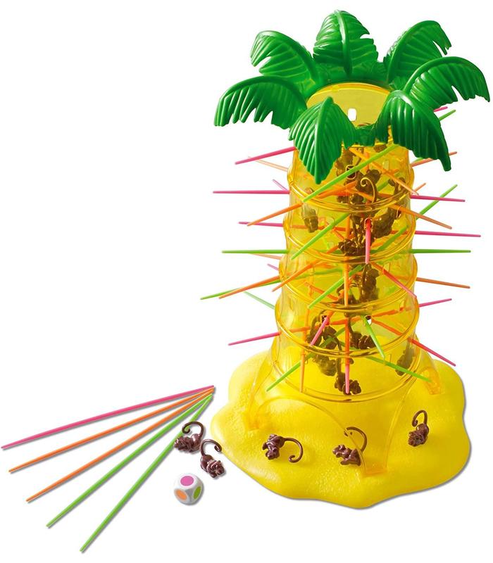 ¡Un juego muy divertido en el que se trata de evitar a toda costa que estos monos se caigan de la palmera! Es muy fácil: sólo se debe lanzar el dado y tratar de sacar un palito del color elegido por el dado sin que se caiga ningún mono. Gana el jugador qu