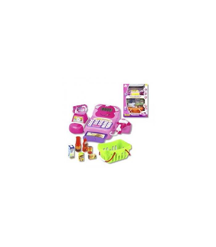 Caja registradora electrónica de color roja con peso, pistola lectora de códigos de barras y cajón. Incluye complementos para hacer la compra como en el supermecado de verdad con cesta, alimentos y mucho más. Medidas: 31 x 43 x 21 cm. Funciona con 3 pilas 1,5V AA incluidas.