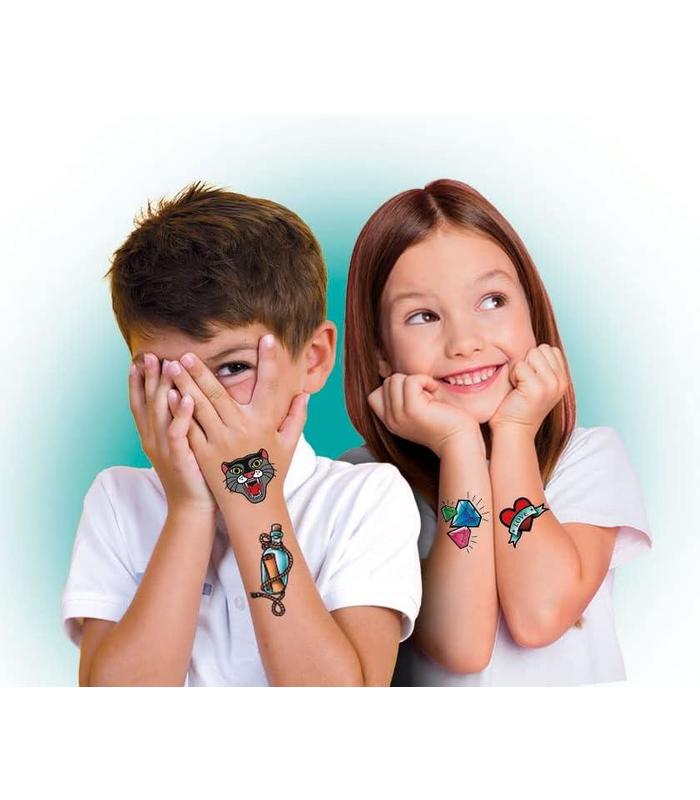 La moda de los tatuahes nunca ha sido tan sorprendente con estos fantásticos tatuajes misteriosos. Un kit con tatuajes transferibles para expresar tu estilo a través de tu piel. Algunos de los tatuajes están cubiertos con una capa especial que no deja ver el diseño hasta que se tatúa. Un juego pensado para todos los niños que quieren imitar el look de los adultos y estar a la moda.Los tatuajes son seguros y están probados en la piel, para jugar con total seguridad.