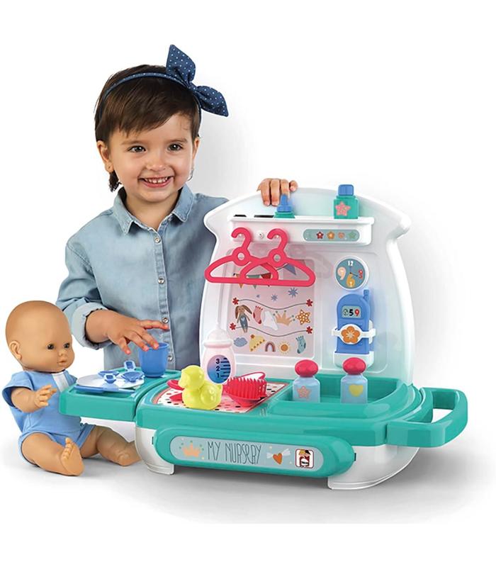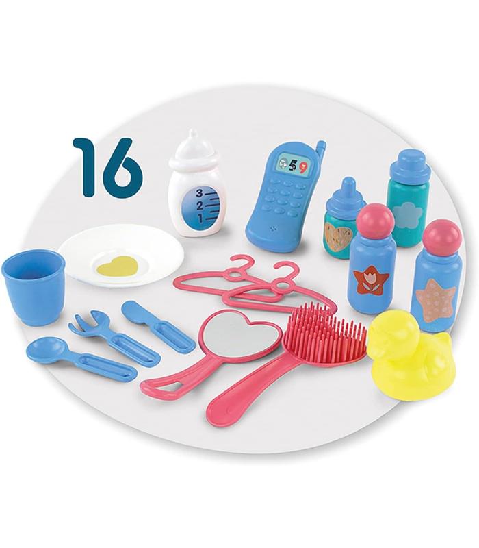 Incluye 16 accesorios para el cuidado del bebé: peine, espejo, perchas, biberón, cubiertos, teléfono y mucho más.