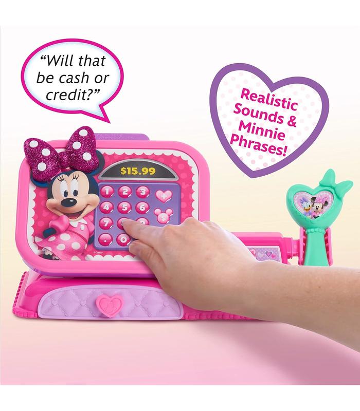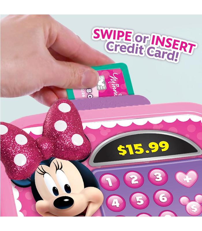 Incluye divertidas frases de Minnie Mouse y sonidos realistas de la caja registradora. Incluye un escáner, monedas y dinero de juguete, así como una tarjeta de crédito de juguete. Excelente para el juego imaginativo. Necesita 2 pilas AA (incluidas). A partir de 3 años