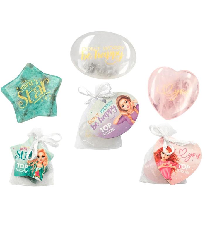 Energía de TOPModel a tope. Estas piedras energéticas son muy bonitas, tienen un tacto maravilloso y cada una tiene un significado mágico. El cuarzo rosa con forma de corazón (texto: I love you) representa el amor, la energía positiva y la armonía. La amazonita verde con forma de estrella (texto: You''re a Star) simboliza la fuerza, el valor y la suerte. El cristal de roca con forma ovalada (texto: Don''t worry, be happy) transmite equilibrio, arrojo y energía. Cada piedra se vende dentro de una bolsita regalo transparente que incluye en el lazo que la remata la descripción de la piedra y sus poderes.