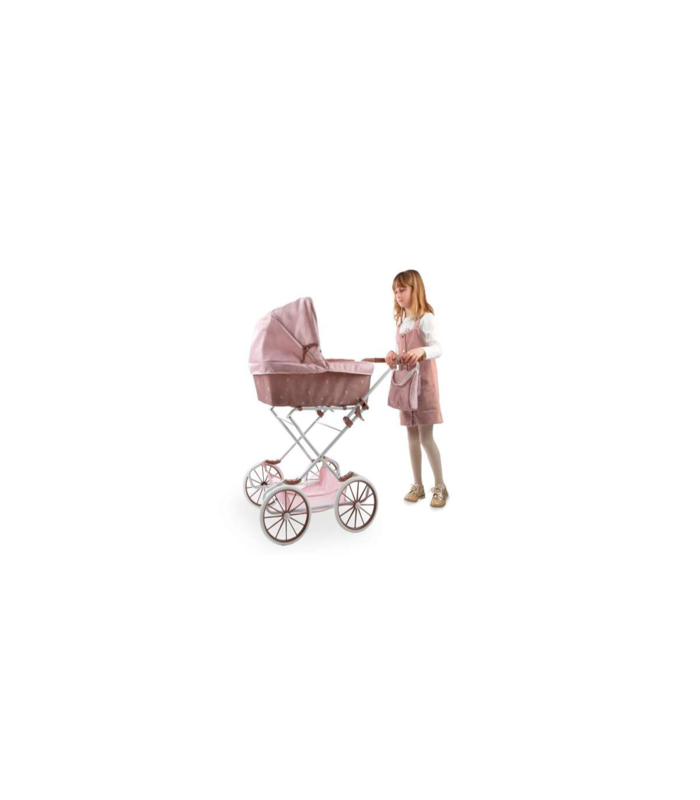 Su capota abatible añade un toque tradicional que protege a la muñeca durante cada paseo, creando una experiencia de juego más auténtica. El carrito incluye un bolso a juego que permite llevar accesorios como biberones, chupetes o pequeños complementos, haciendo el juego simbólico mucho más completo. Es un detalle que encanta a los peques porque les ayuda a recrear rutinas del día a día mientras cuidan de su muñeca favorita.