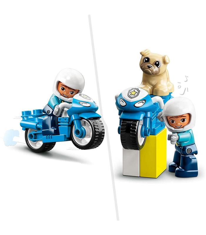 Este juego de construcción cuenta con una moto de policía de rescate LEGO DUPLO, una figura de oficial de policía LEGO DUPLO y una figura de perro LEGO DUPLO