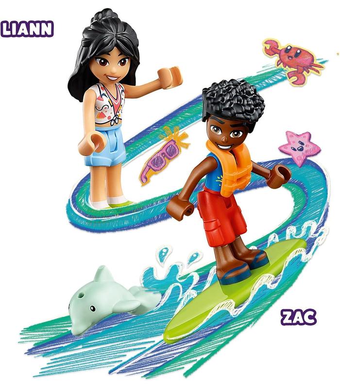 Incluye las mini muñecas LEGO Friends de Liann y Zac, con una tabla de surf, un perrito Pug con un tazón de hueso y agua, además de una figura de un delfín de juguete