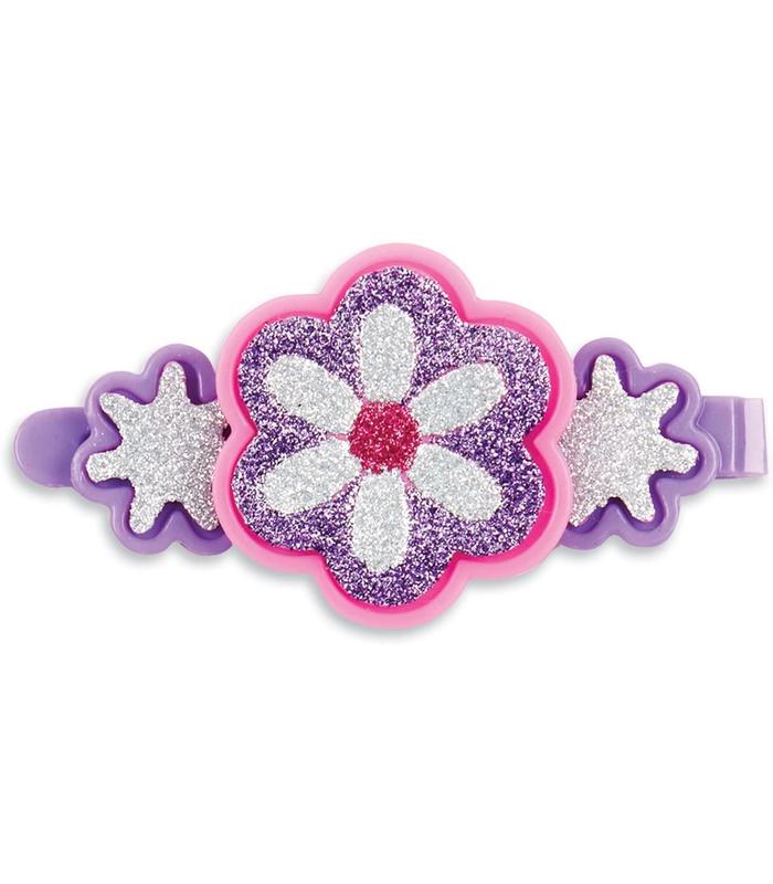 Incluye 2 vinchas, 6 prensas para pelo, 10 piezas decorativas, 1 lámina de calcomanías y 5 láminas de brillantina