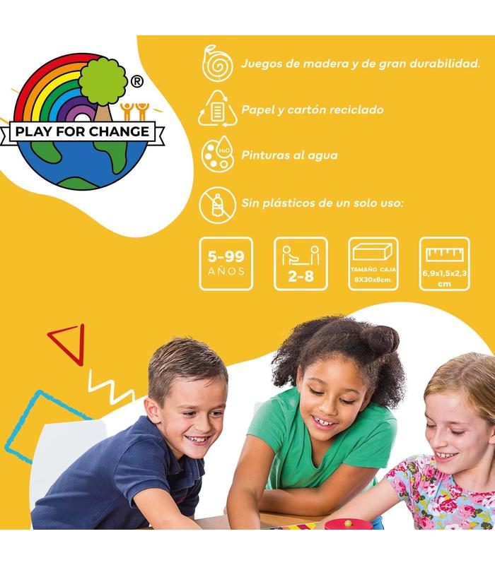 ESPECIFICACIONES TÉCNICAS: El juego incluye 1 dado de madera (16 x 16 x 16 mm) con 6 colores y 54 bloques rectangulares de madera (69 x 15 x 63 mm) en 6 colores. Cuenta con la calificación Play For Change por el uso de materiales responsables.