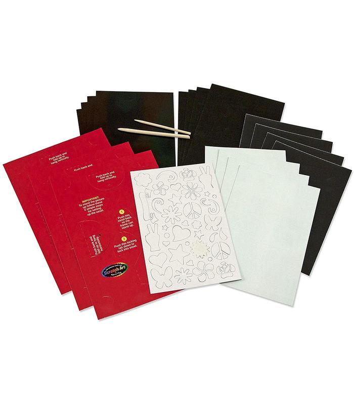 Incluye 16 páginas variadas de Scratch Art (4 de cada: de color plata, holográfico, con capa negra y remolinos multicolores, con capa blanca y remolinos multicolores y reflectantes)