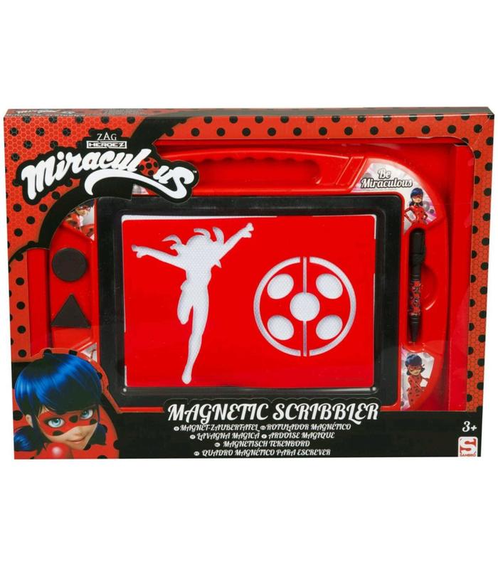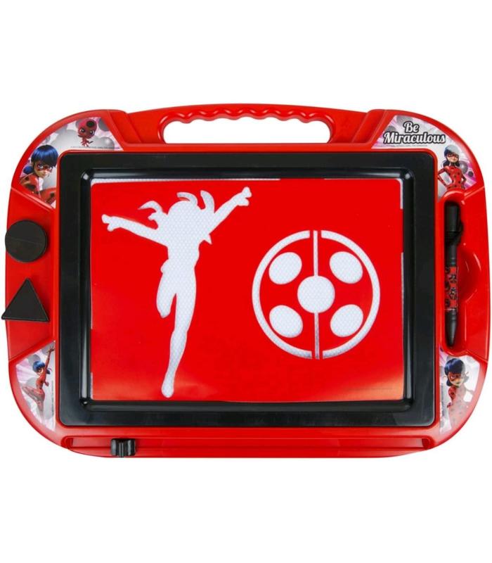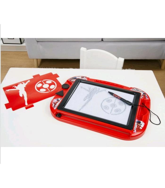 Incluye lápiz magnético y sellos con diferentes formas para que puedan crear grandes diseños. Además de una plantilla con formas.