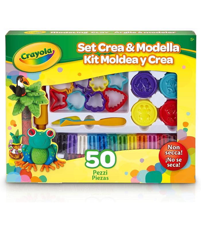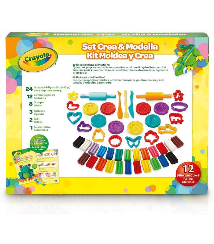 KIT CREA Y MOLDEA: un rico conjunto con muchísimas herramientas, moldes y sellos para modelar la plastilina; el paquete contiene: 24 bloques de plastilina de 12 colores surtidos, 12 plantillas, 8 moldes, 3 espátulas, 1 rodillo